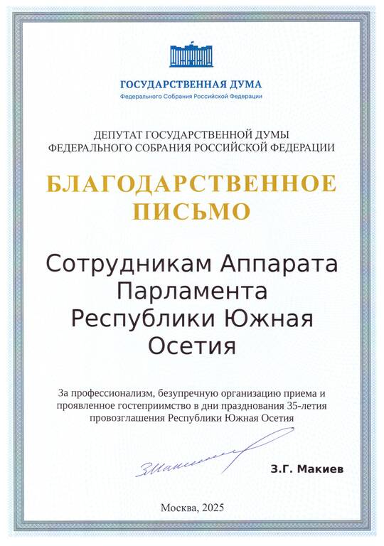 В знак искренней признательности за профессионализм, безупречную организацию приема и проявленное гостеприимство в дни празднования 35-летия провозглашения Республики Южная Осетия, депутат Государственной Думы Федерального Собрания Российской Федерации Зураб Макиев направил благодарственное письмо в парламент Южной Осетии, где выразил глубокую признательность сотрудникам аппарата законодательного органа республики.